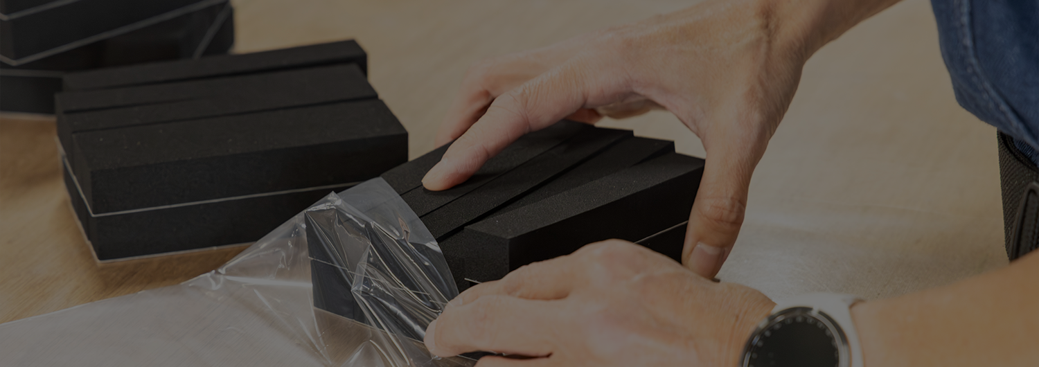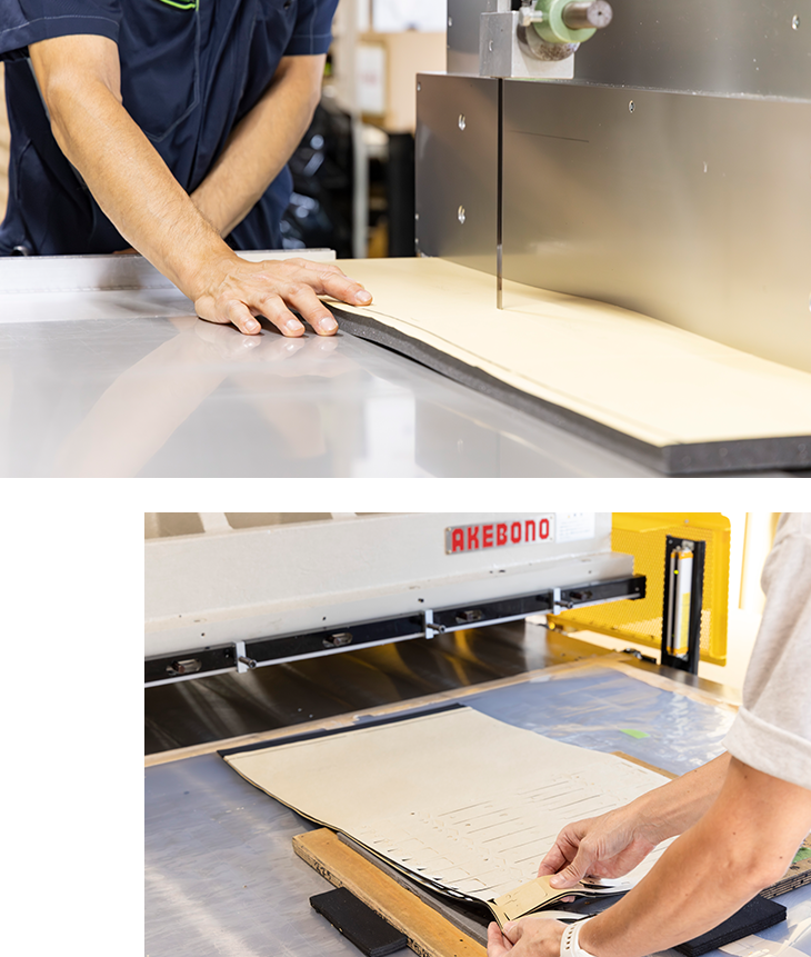 一言でスポンジといっても硬さや厚みなどは様々。軽すぎて機械任せにできない材料も人の手でサポートして加工していきます。製造する製品は日々変化するので、工場のメンバーで協力・手分けして納期に間に合うよう、様々な設備を駆使して製造を行います。