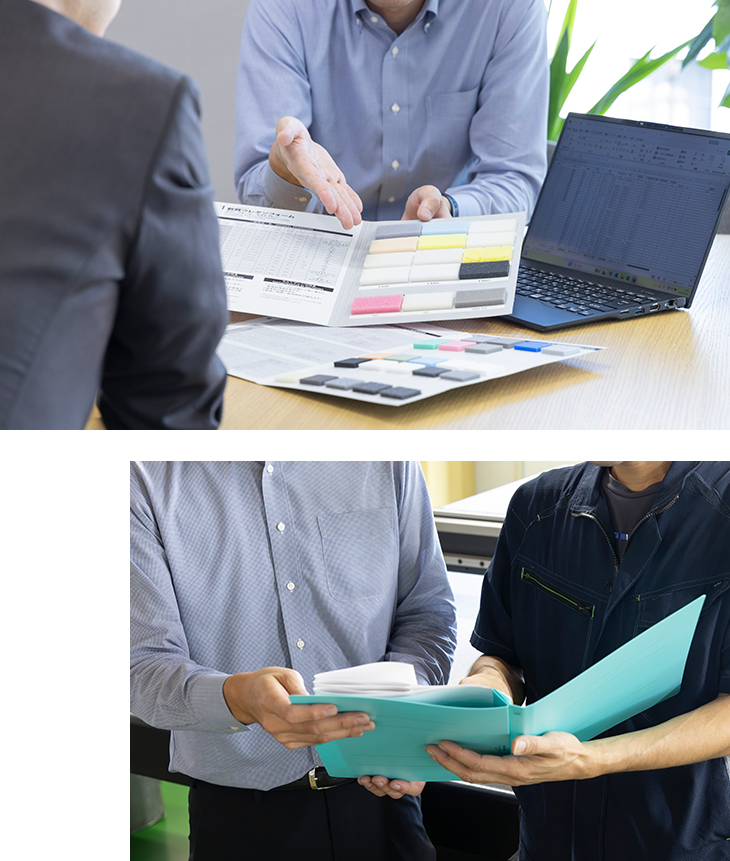 お客様と直に接する“当社の顔”であり、お客様の声やご要望を社内の各部署に繋ぎ、納品まで伴走するハブとしての役割を果たします。