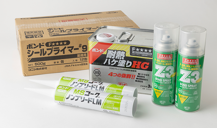 建材向けの接着剤・シーリング材・パテ材、屋上防水シート、塗膜防水剤、バッカー材、各種目地材などを取り扱っています。建設・土木工事に必要とされる各種住宅部材などを取り揃え、安全施工のサポートをしています。